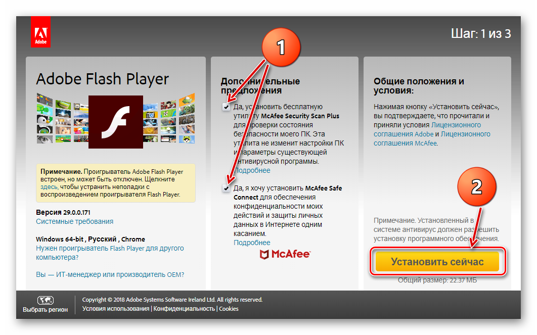 Фактором того, что Одноклассники грузятся не полностью, может быть отсутствующий Flash Player на компьютере при эксплуатации браузера не на движке Chromium или устаревшая версия web-обозревателя на базе Chrome. Обновите свой браузер и/или Flash Player с официальной страницы, сняв флажки с отмеченных опций.
