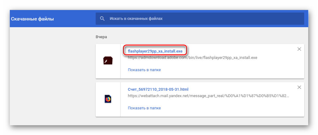 В папке скачанных файлов находим инсталлятор флеш-плеера и запускаем его.