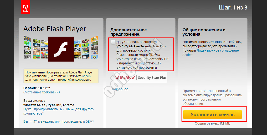 3. Зайдя на сайт компании, необходимо нажать на большую желтую кнопку «Установить сейчас». Кроме того, будет предложена установка сторонней программы McAfee Security Scan Plus, от чего можно отказаться, убрав соответствующую галочку (большинство пользователей отказываются).