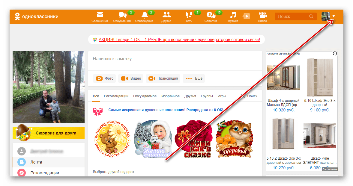 - Открываем в браузере сайт odnoklassniki.ru, вводим логин и пароль, в верхнем правом углу страницы около маленькой аватарки нажимаем на значок треугольника.
