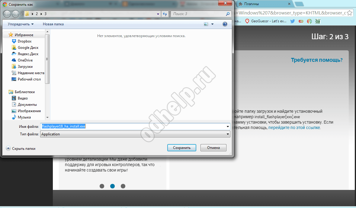 4. Далее вы будете перенаправлена на страницу с инициализацией приложения. После чего появится вот такое окно, где вам будет предложено сохранить инсталлятор, с помощью которого и можно установить Adobe Flash Player. Жмем на «Сохранить» и запускаем файл, следуя всем инструкциям.