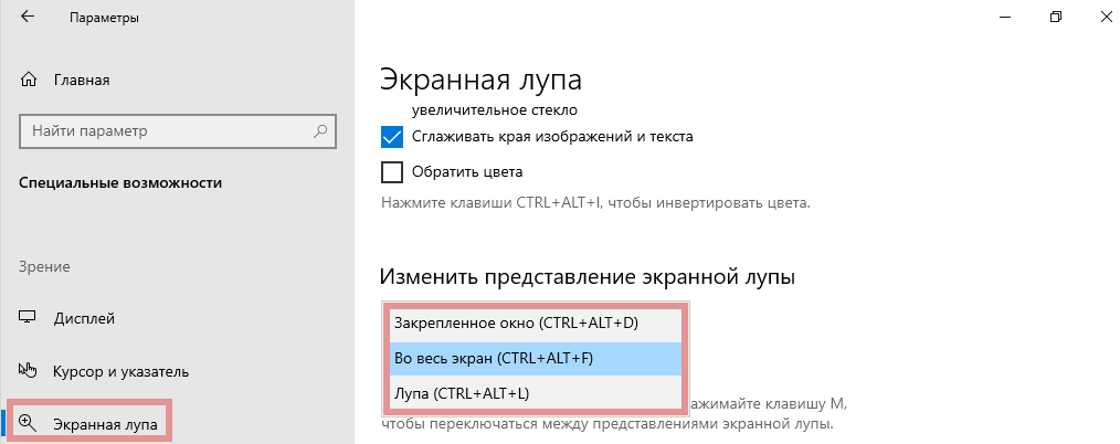 Выберите подходящее вам представление «увеличительного стекла». Предусмотрены три варианты — показаны на скриншоте.