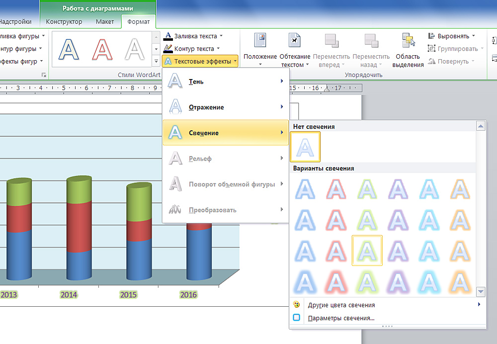 На этой панели есть настройки обтекания текстом. Вы можете вставить текст в рисунок из WordArt и добавить различные эффекты. Чтобы сформировать уникальную и запоминающуюся диаграмму, не надо использовать сразу весь инструментарий Word на небольшом куске иллюстрации.