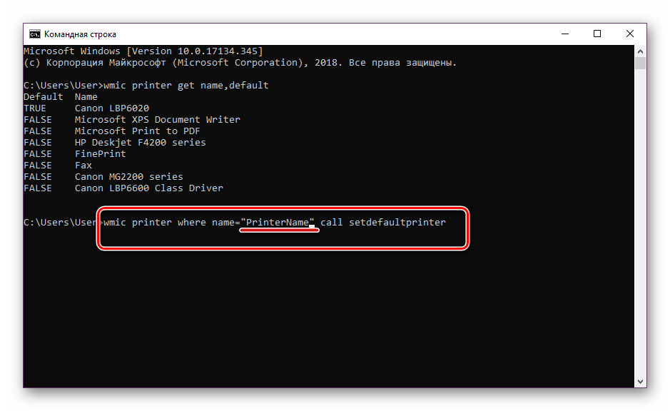 Теперь напечатайте такую строку: wmic printer where name=”PrinterName” call setdefaultprinter, где PrinterName – имя девайса, который вы хотите установить по умолчанию.