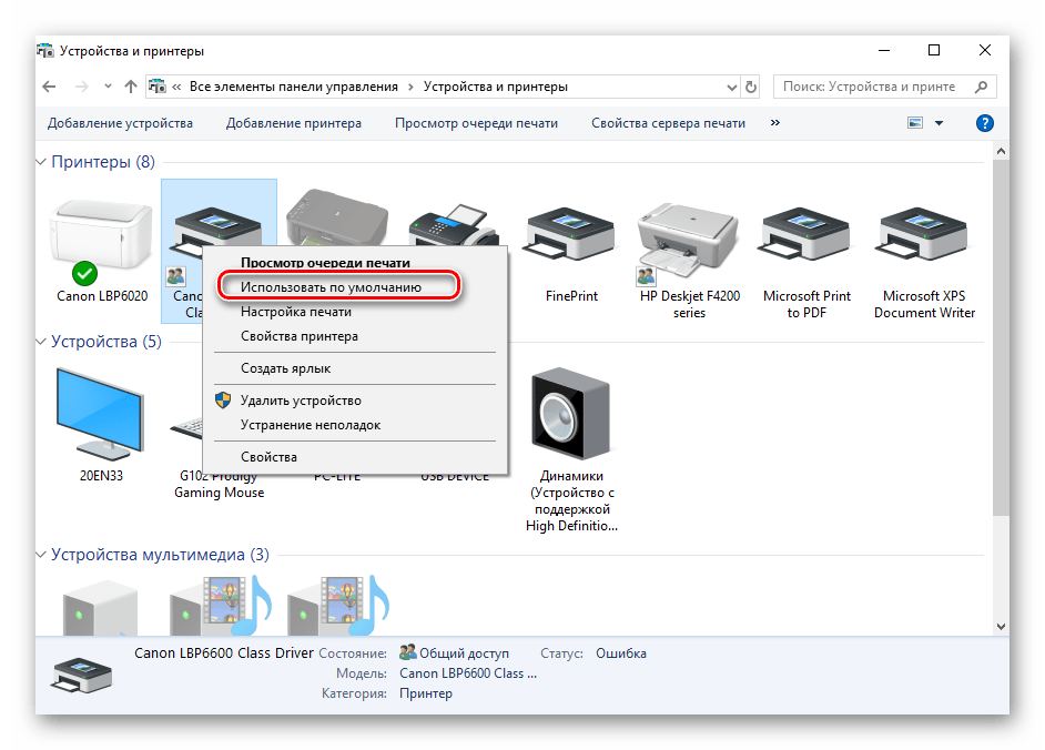 После этого отобразятся все принтеры, которые подключены к вашему компьютеру. Выбираете нужный из них, жмете по нему правой кнопкой мыши и в открывшемся меню выбираете «Использовать по умолчанию».