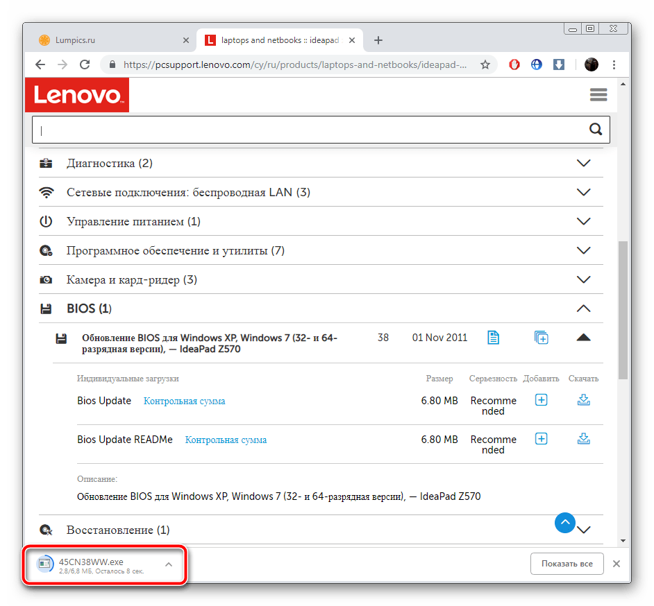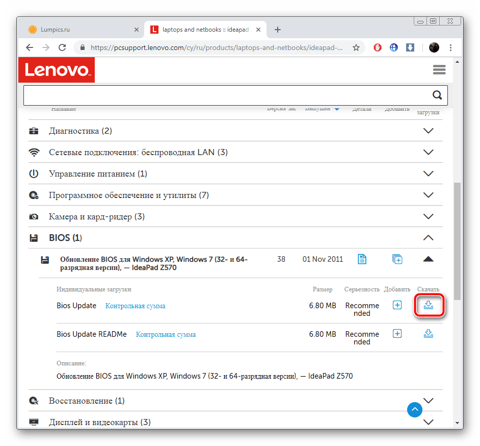 - Скачайте файл с программой для обновления, сохраните на жёстком диске. Затем загрузите ещё и новую версию BIOS для вашего оборудования.