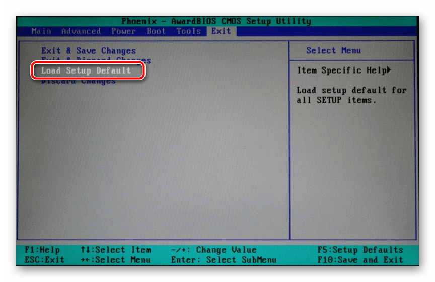 Во вкладке «Exit» отыщите пункт «Load Setup Default» и подтвердите изменения. Так вы загрузите базовые настройки БИОС.