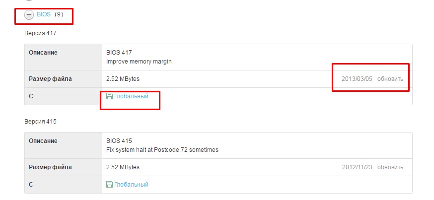 Еще раз кликните на название «Обновление BIOS», чтобы просмотреть все доступные версии.