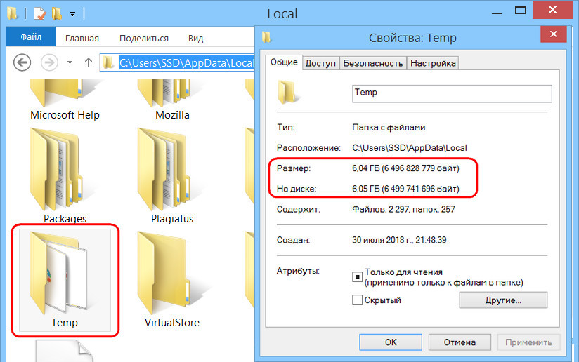 В папках «Temp» сберегаются временные данные, и их вес может быть причиной захламления диска С.