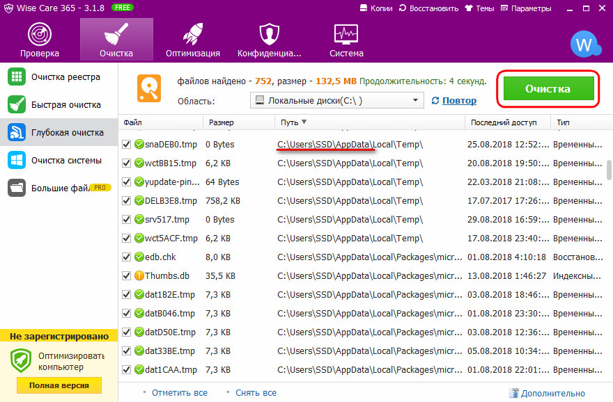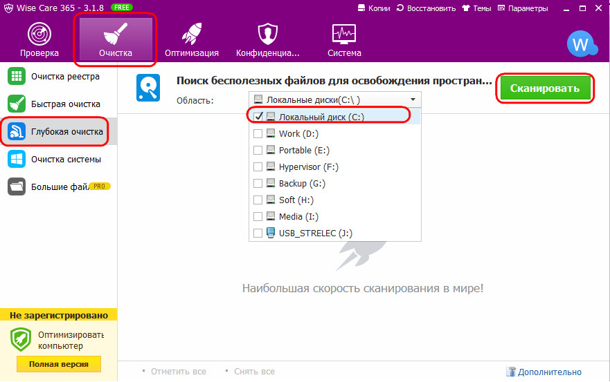 Эту папку со всеми её подпапками необходимо исследовать и убрать из неё каталоги удалённых программ. Альтернатива – автоматизированный процесс глубокой очистки с помощью программы Wise Care 365. Выбираем для глубокой очистки диск С, сканируем.