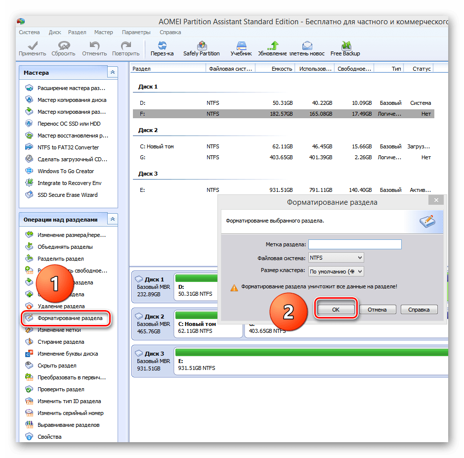 Для форматирования жесткого диска через BIOS можно применить один из множества дисковых менеджеров от различных разработчиков. Например, свободно распространяемый AOMEI Partition Assistant Standard Edition.