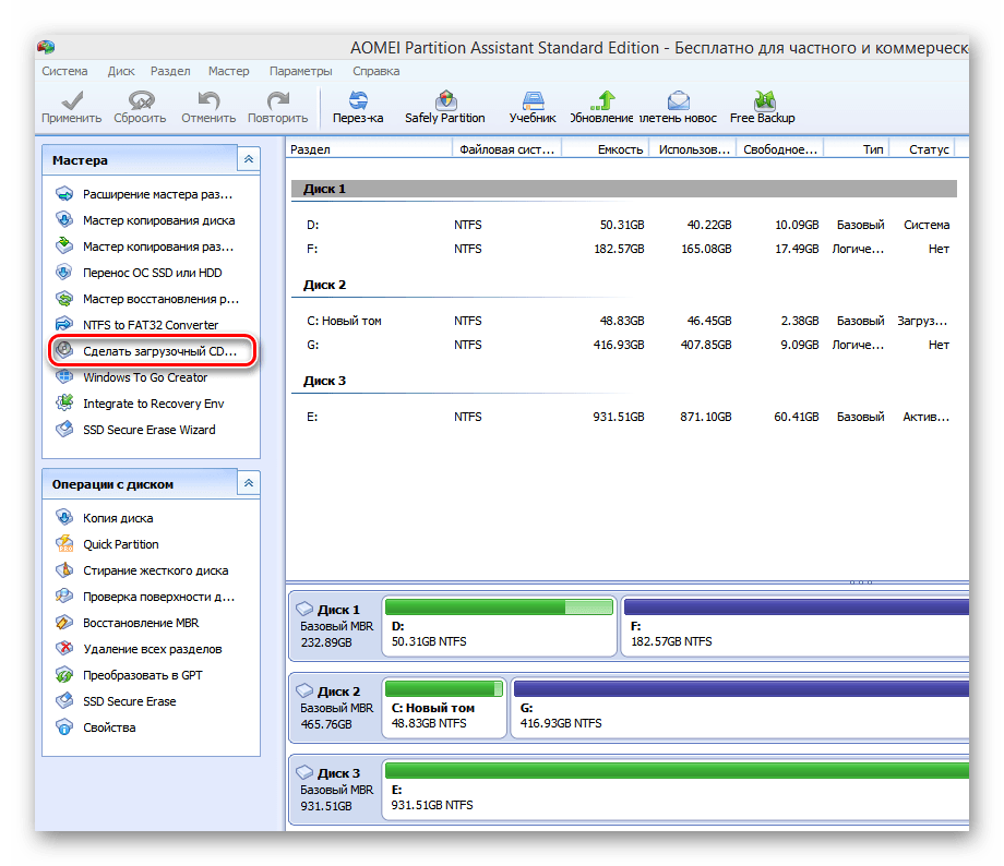 - Скачиваем, устанавливаем и запускаем программу. Сначала нам надо создать загрузочный носитель на платформе Windows PE, облегченной версии оперативной системы. Для этого переходим в раздел «Сделать загрузочный CD».