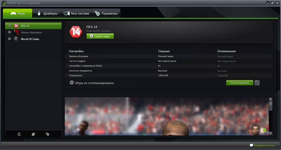 Первое окно «Игры» содержит список установленных на компьютере игр, которые также находятся в базе данных GeForce Experience на сервере Nvidia. «Оптимизация» подразумевает видеонастройку игры, которая является оптимальной по критерию «качество/производительность». Практически, это помогает сэкономить время на ручных видеонастройках, после чего приходится тестировать игру на количество «FPS» и тому подобное. Что касается списка игр, оптимизация которых поддерживается GeForce Experience, его можно посмотреть в разделе «Поддерживаемые PC игры» на сайте производителя программы.