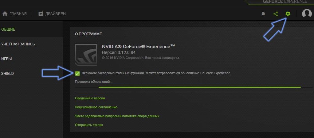 В разделе «О программе» установите флажок «Включить экспериментальные функции». После выбора этого пункта нужно перезапустить программу GeForce Experience, чтобы доустановились необходимые инструменты, в том числе NVIDIA Freestyle.