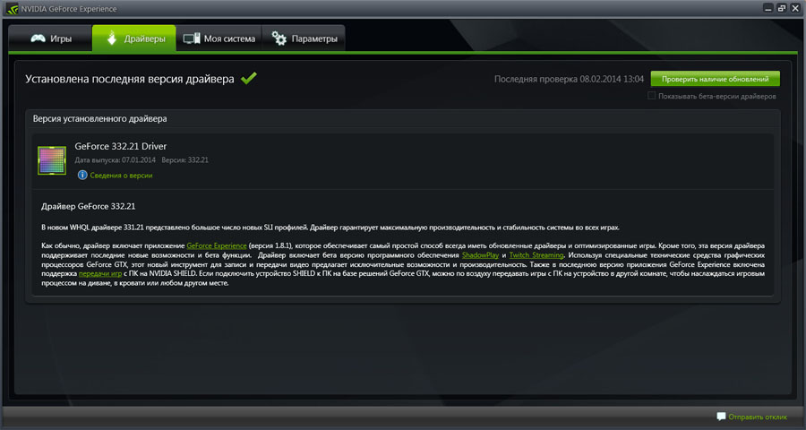 Второе окно «Драйверы» содержит информацию о текущем видеодрайвере, а также возможность обновить его до последнего с сайта производителя через интернет. Возле кнопки «Проверить наличие обновлений» есть пункт «Показывать бета-версии«. Если поставить на нем галочку, при обновлении будут доступны также бета (то есть тестовые) версии драйвера.