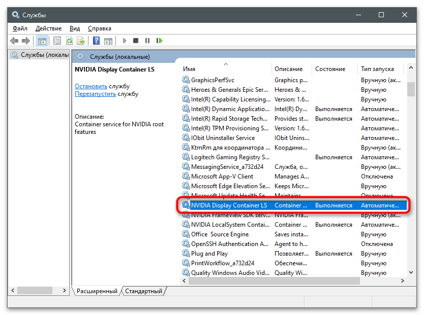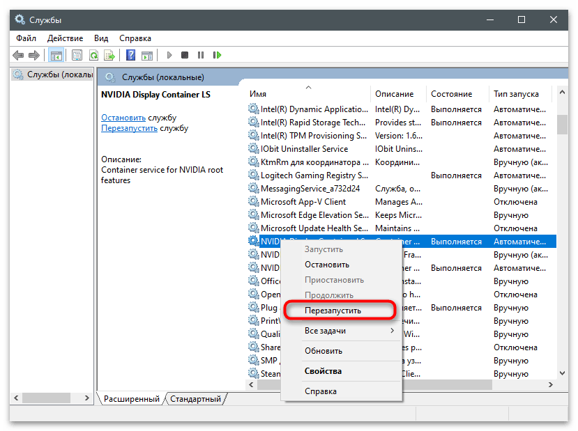 За работу оверлея от NVIDIA в операционной системе отвечает служба, запускаемая автоматически. Если по каким-то причинам она перестала работать или произошел сбой, существует вероятность возникновения проблем с запуском ShadowPlay. Для проверки службы ее нужно перезапустить, что производится так: