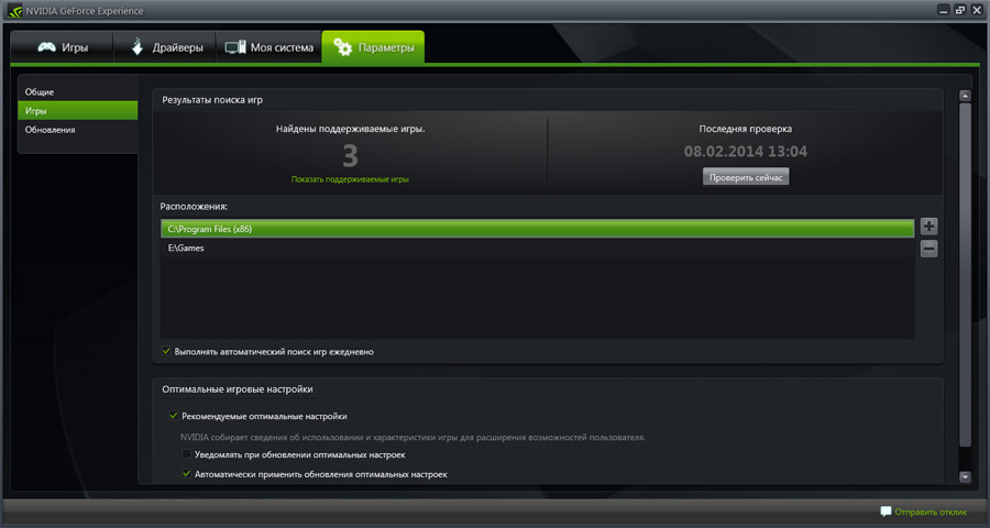 В подразделе «Игры» важно настроить директорию сканирования GeForce Experience на наличие игр, то есть пути к папкам, в которых содержатся установленные игры. По умолчанию здесь C:Program Files