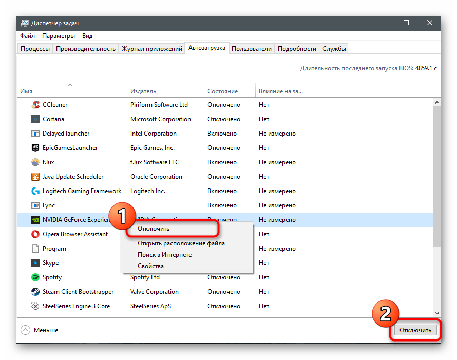Основное действие — отключение автозагрузки рассматриваемой программы, чтобы она не открывалась вместе с операционной системой и лишний раз не нагружала процессор. Эту инструкцию следует выполнить в том случае, если вы хотите вызывать NVIDIA GeForce Experience только по собственному желанию. Убрать ее из автозагрузки не так сложно: