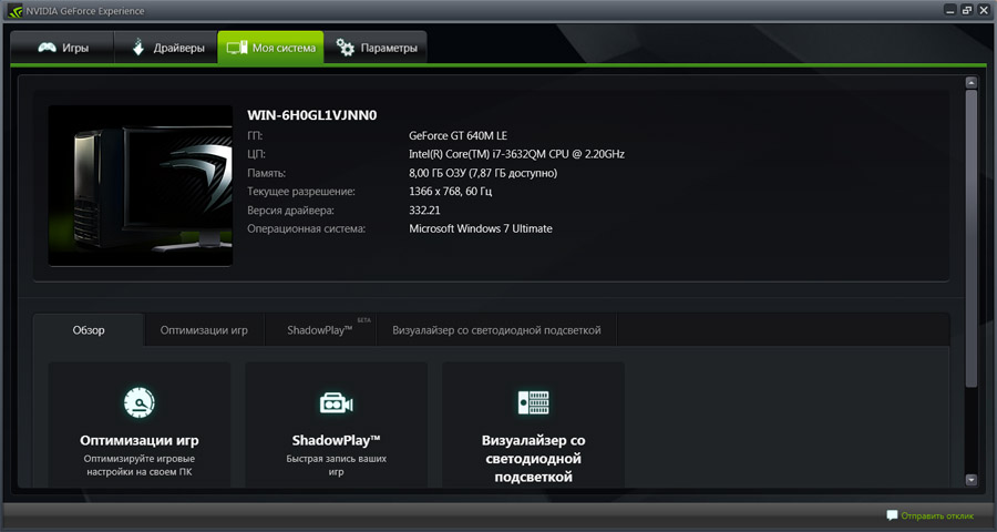 Рис. 3 Раздел «Моя система» в программе GeForce Experience.