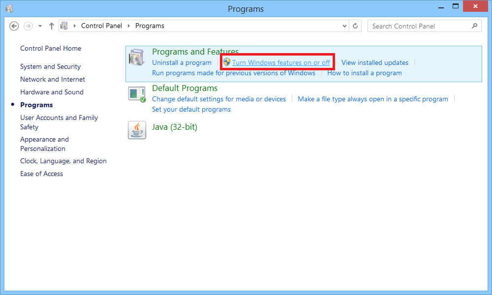 2. Перейдите в Панель управления → Программы → Включение или отключение компонентов Windows.