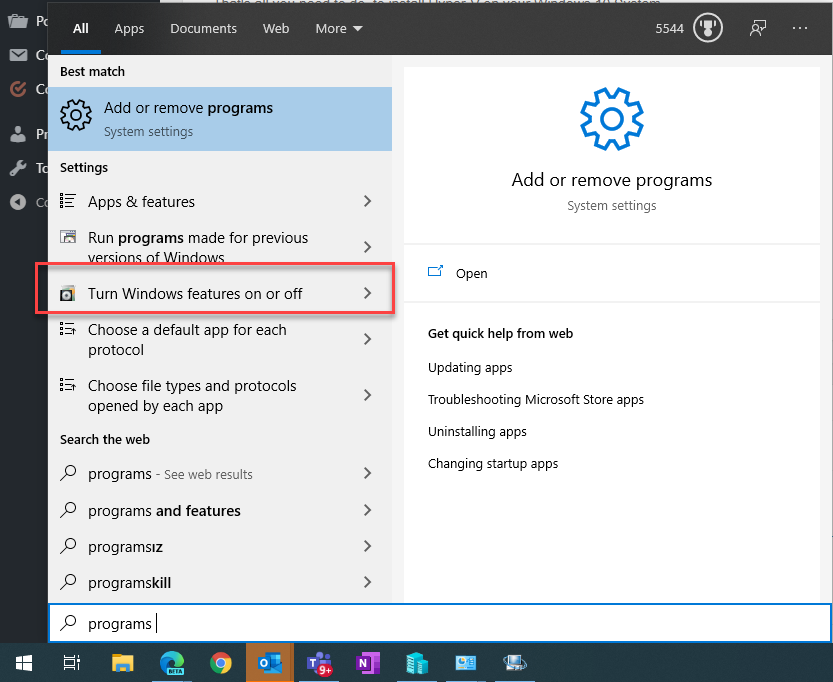 The easiest way is to search for Hyper-V in the Start Menu. It will then point to “Turn On or Off Windows Feature” Window in the Control Panel