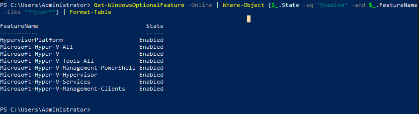 Get-WindowsOptionalFeature -Online | Where-Object {$_.State -eq “Enabled” -and $_.FeatureName -like “*Hyper*”} | Format-Table