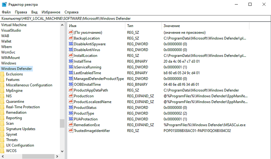 Для возобновления работы защитника нужно будет удалить все созданные параметры.