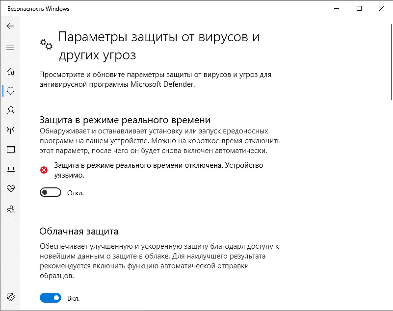 - Выключить защиту в реальном времени: установите переключатель в положение «Включено».