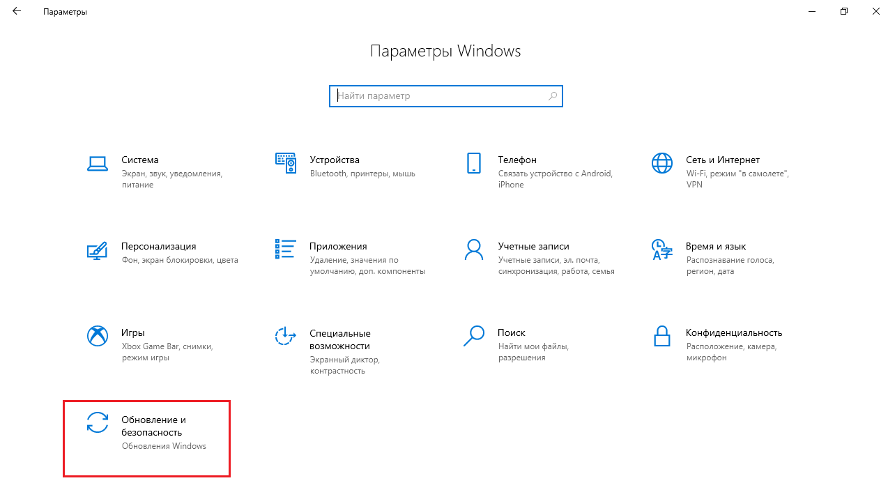 Открываем «Пуск» -> «Параметры», заходим в «Обновление и безопасность»: