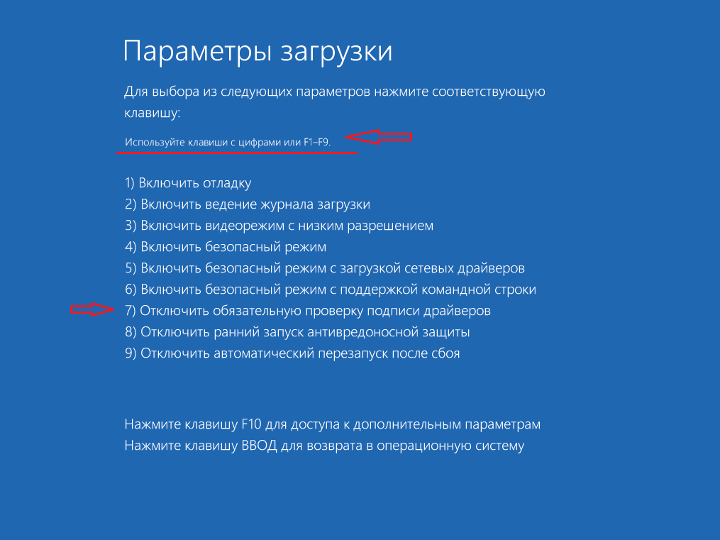 В открывшемся меню «Параметры загрузки», необходимо нажать на клавиатуре F7 или цифру 7, чтобы выбрать вариант «Отключить обязательную проверку подписи драйверов»: