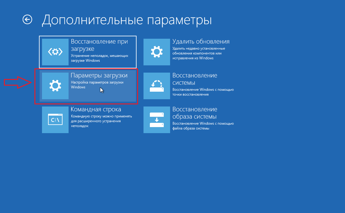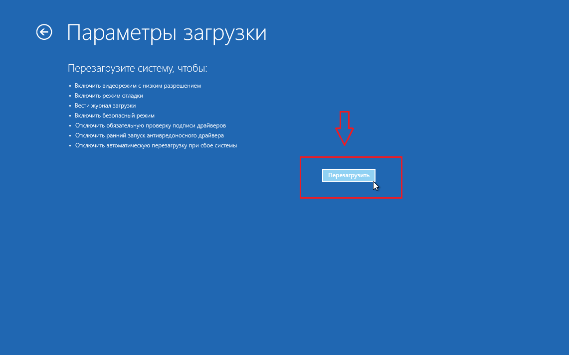 В открывшемся меню «Параметры загрузки», нажимаем «Перезагрузить»: