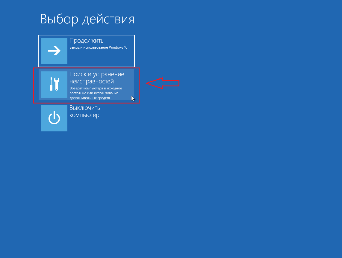 - После выполнения перезагрузки, в окне «Выбор действия» нажмите на «Поиск и устранение неисправностей».