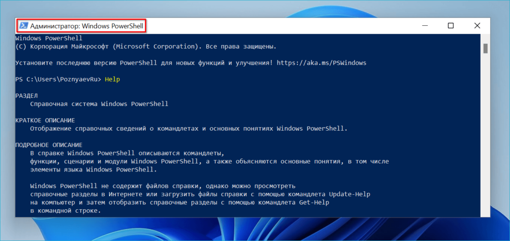 Функционал PowerShell значительно шире чем у CMD. Инструмент представлен в 2006 году. Визуально и по набору возможностей больше соответствует задачам пользователя Windows 11. Актуальное для начинающих пользователей преимущество — команда Help, которая позволяет получить справку о командлетах.