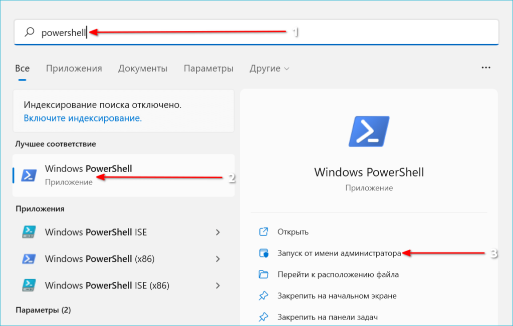 Запустите приложение «Windows PowerShell» от имени администратора щелчком по соответствующему пункту меню данной программы. Меню находится в правой части окна результатов поиска.