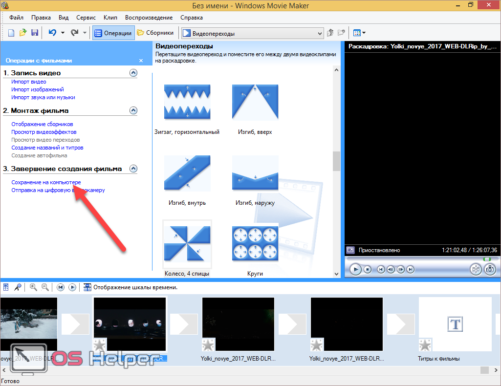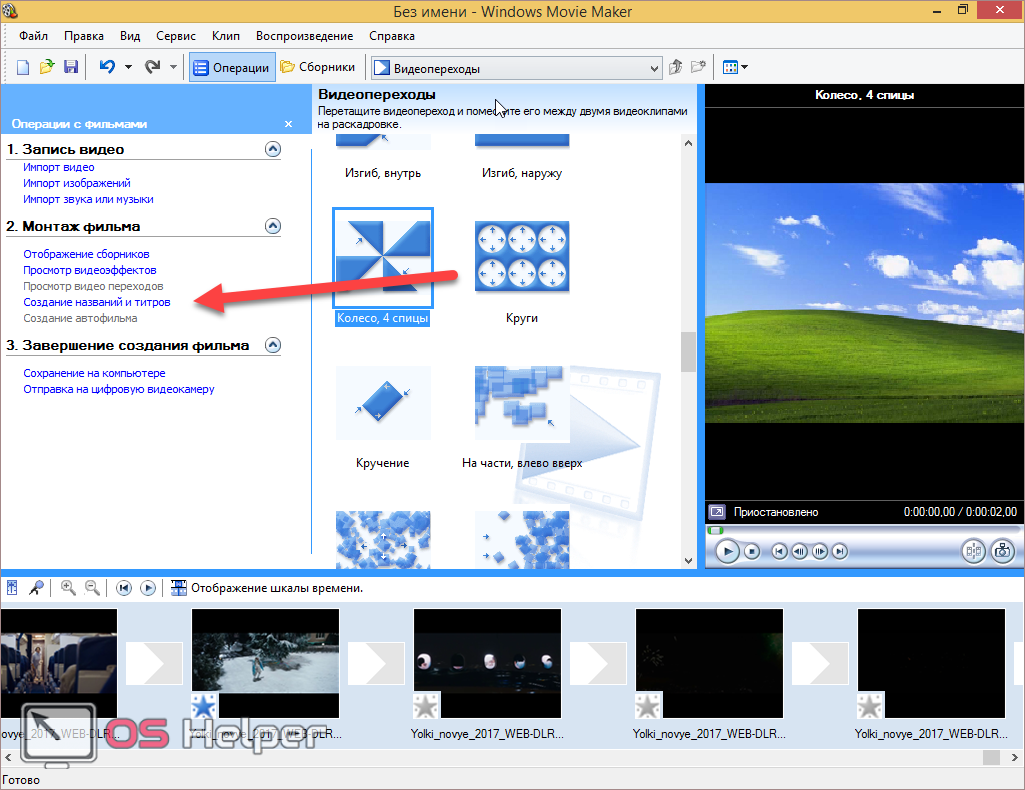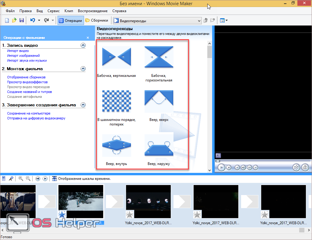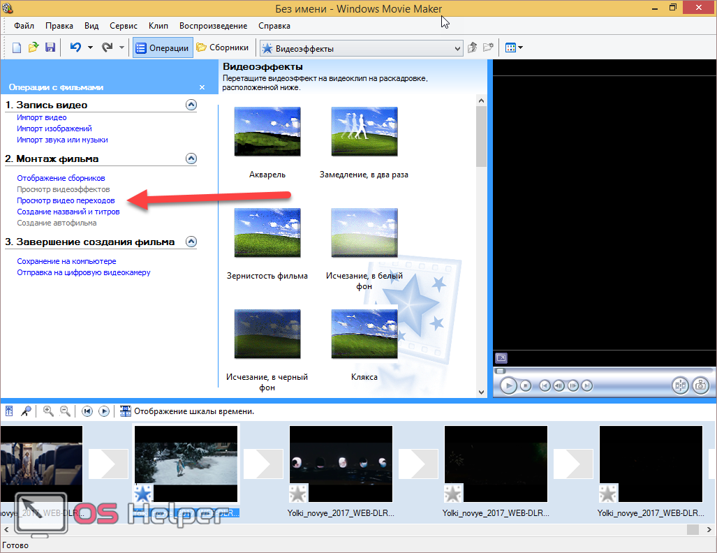 - Чтобы добавить переходы, в левой панели разверните меню «Монтаж фильма» и выберите «Просмотр видео переходов».