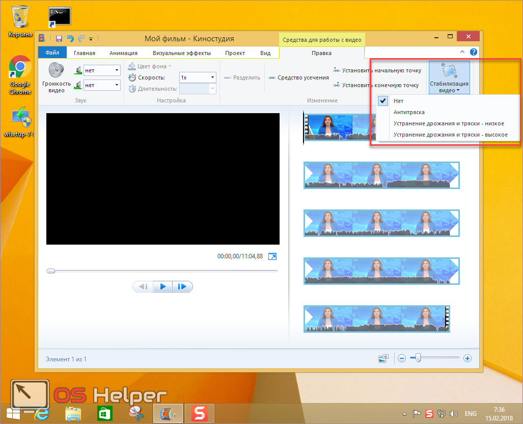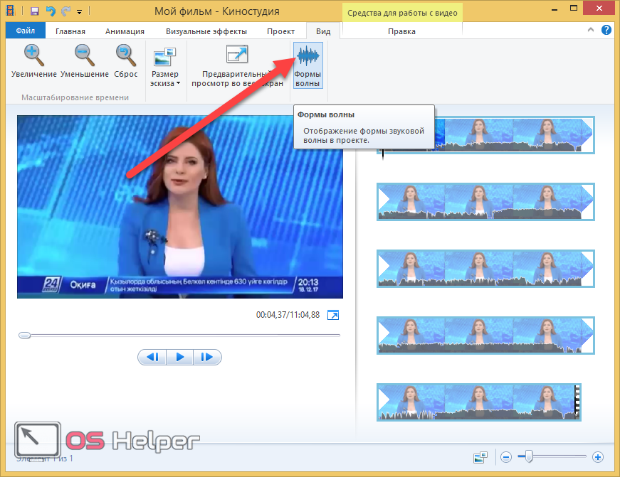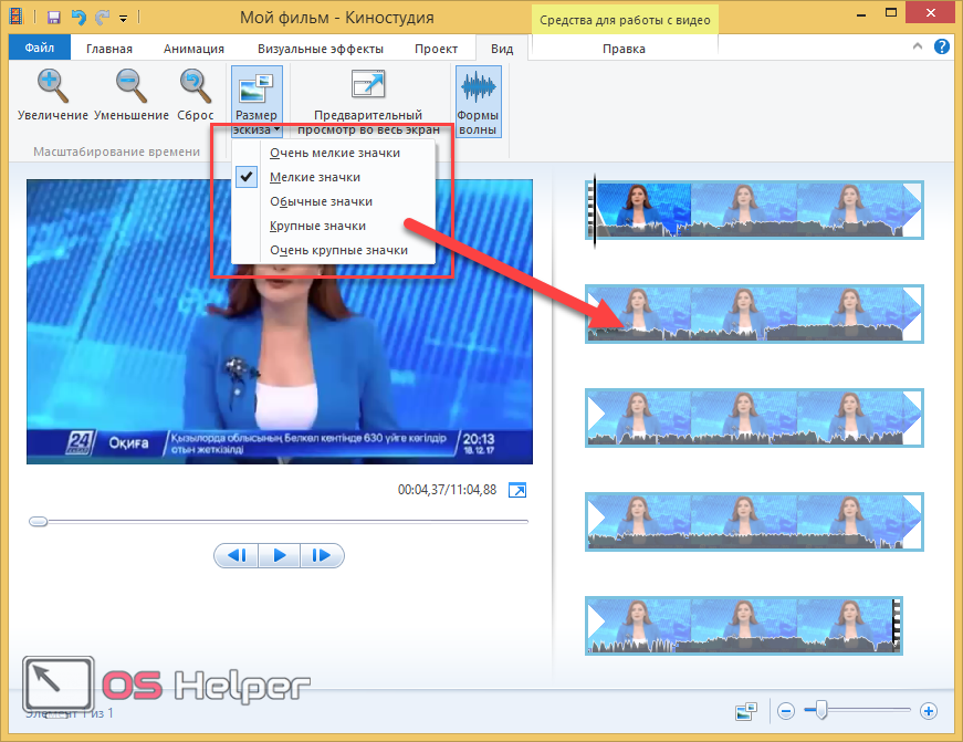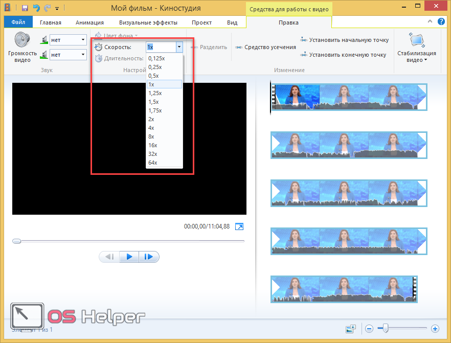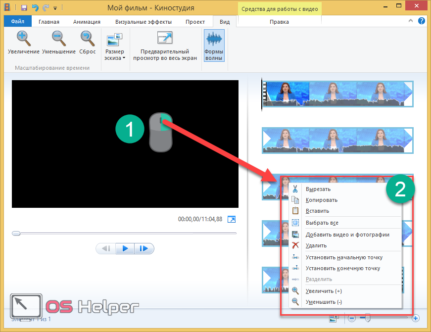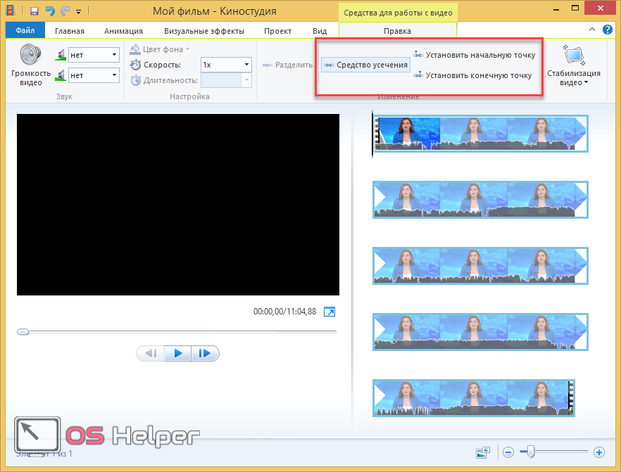Режим раскадровки удобен при добавлении переходов и видеоэффектов. Шкала времени позволяет с большой точностью обрезать и удлинять фрагменты видео, что крайне необходимо при монтаже.
