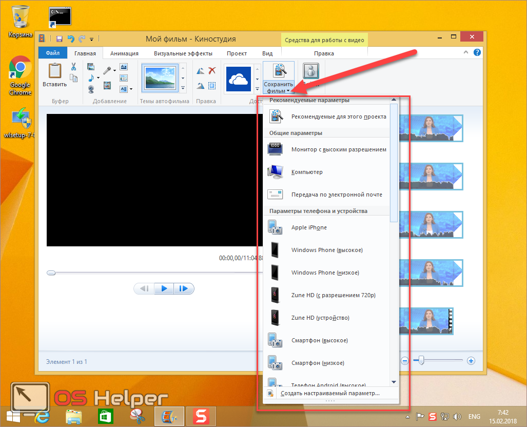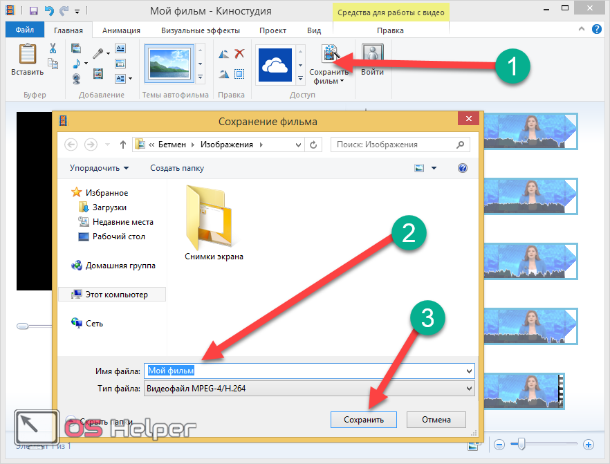Для экспорта результата ваших трудов используется вкладка «Главная». Но тут не всё так просто, как может показаться на первый взгляд. Сначала попробуйте просто нажать на кнопку «Сохранить фильм».