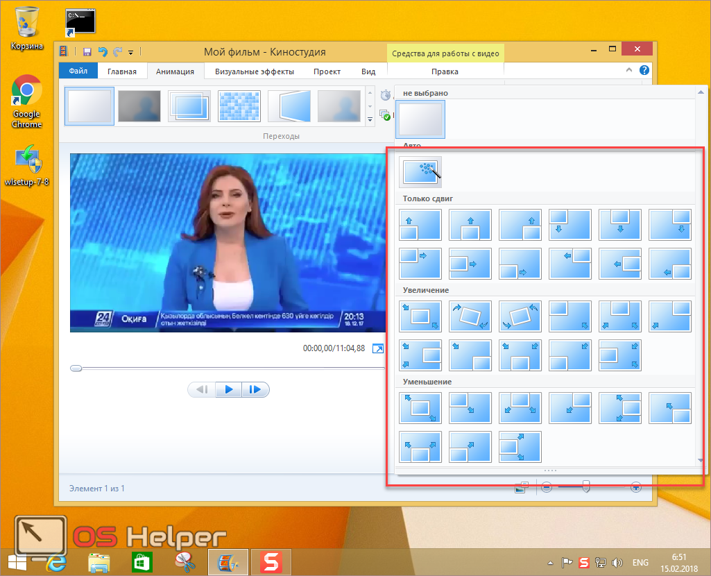 3. Чтобы добавить лучшего эффекта, нужно научиться вставлять между эпизодами яркие переходы, которые предадут видео более плавный и профессиональный вид. Для этого нужно зайти по кнопке Сервис и выбрать «Видеопереходы». Перед вами появится множество разных вариантов, из которых вы можете выбрать свой и путем перетаскивания поместить его между кадрами.