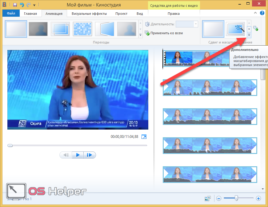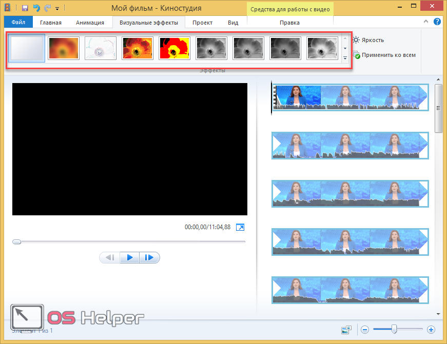Для этого используется соответствующая строка в панели задач. Выбранные эффекты, опять же, нужно просто перетянуть на нужный кадр в шкале. При этом к каждому кадру (или к разбитым частям основного импортированного элемента) можно применять свой собственный эффект.