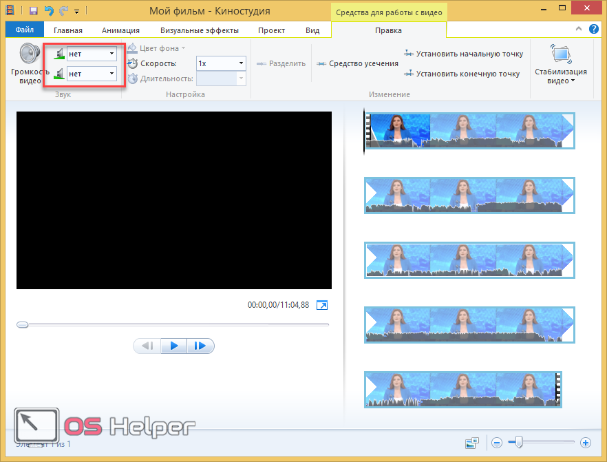 Если нужно убрать звук из ролика, сделать это можно через меню «Клип». Наведите курсор на строку «Аудио» и в появившемся списке кликните по «Выключить».