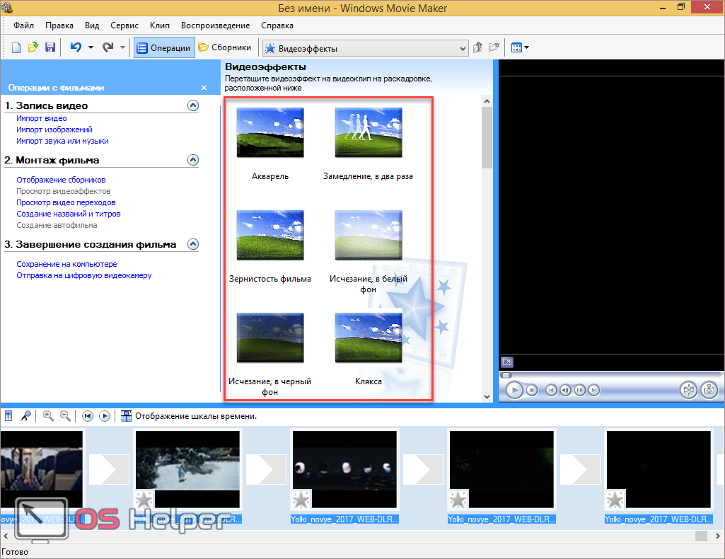 4. Кроме видеопереходов, между клипами можно вставить и видеоэффекты, которые вы найдете в выпадающем списке «Видеоэффекты», справа от панели Сборники. Добавить видеоэффект так же просто, как и переход: путем перетаскивания на кадр.