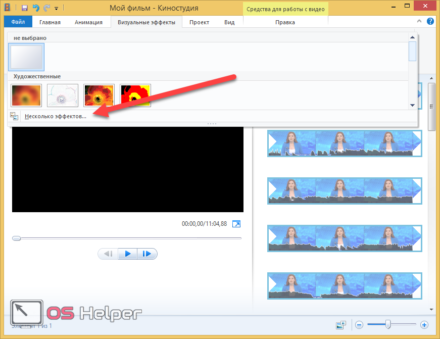 Так же в открывшемся списке появится кнопка для наложения нескольких эффектов.
