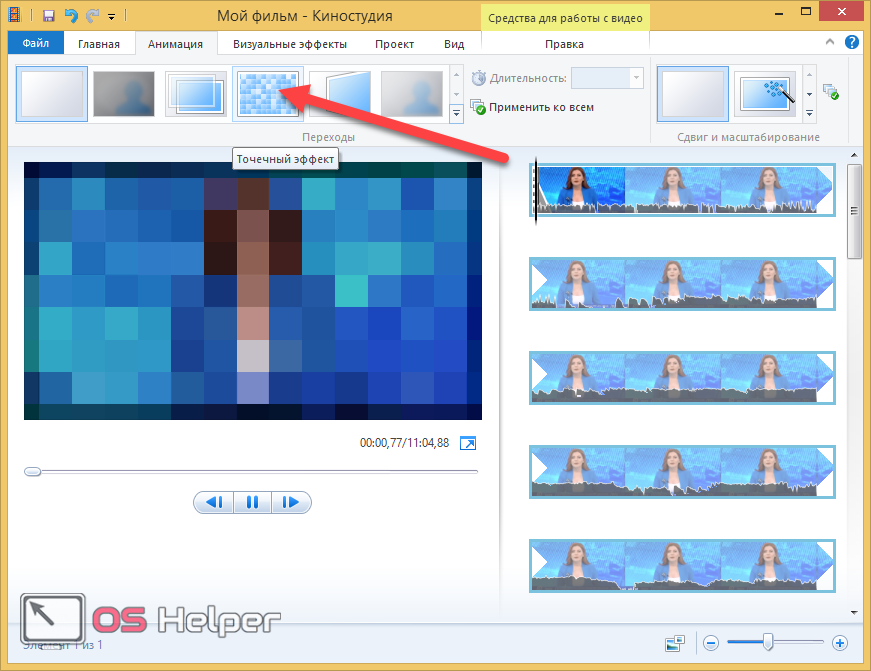 Итак, предварительные действия закончены. Теперь, чтобы ролик стал более привлекательным, а картинки не сменялись резко, нужно вставить переходы (перетекание или преобразование одного изображения в другое при их смене).