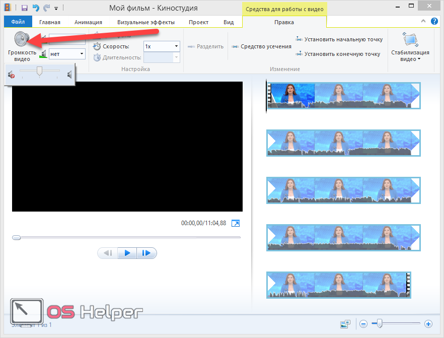 Есть еще один способ регулировки громкости . Для этого выберите на шкале раскадровки аудио или видео файл, для которого нужно определить уровень звука. Затем щелкните по меню «Клип», наведите курсор на «Аудио» и в появившемся списке нажмите на «Громкость». В шкале сделайте нужные настройки.