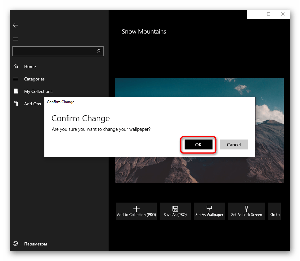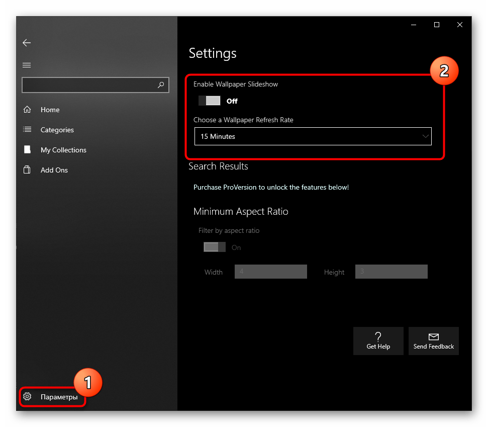 При желании настроить автоматическую смену изображений перейдите в «Параметры» и активируйте там соответствующую функцию. Дополнительно можете установить время, через которое фон заменится другим.
