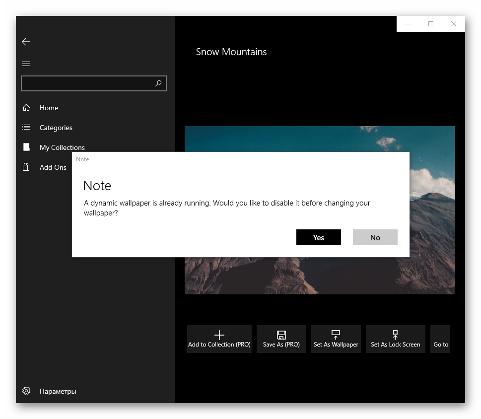 В первый раз приложение уведомит о том, что сейчас включено динамическое переключение изображений, и предложит выключить эту функцию. Если вы не хотите, чтобы картинка сама менялась спустя время, нажмите «Yes», а если устраивает вариант автоматической смены, выберите «No» — во втором случае выбранный фон не будет установлен.