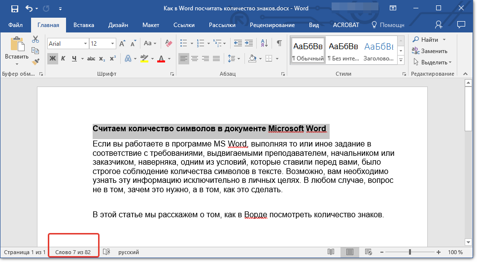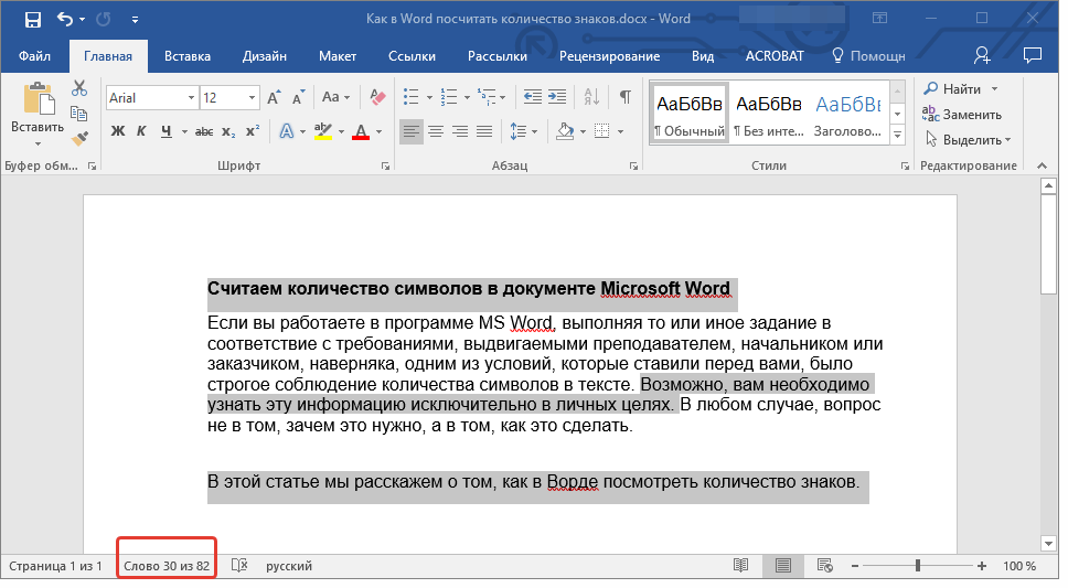2. В строке состояния будет показано количество слов в выделенном вами фрагменте текста в виде “Слово 7 из 82”, где 7 — это число слов в выделенном фрагменте, а 82 — во всем тексте.