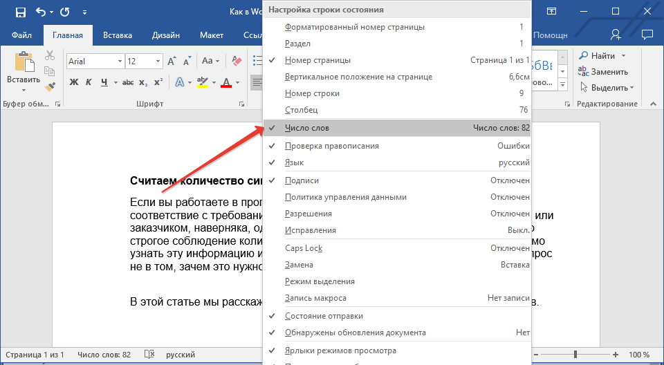 Здесь в выпадающем меню нужно поставить галочку напротив Число слов. После такого простого действия на нижней панели появляется заветная надпись, с помощью которой можно узнать количество знаков в статье.