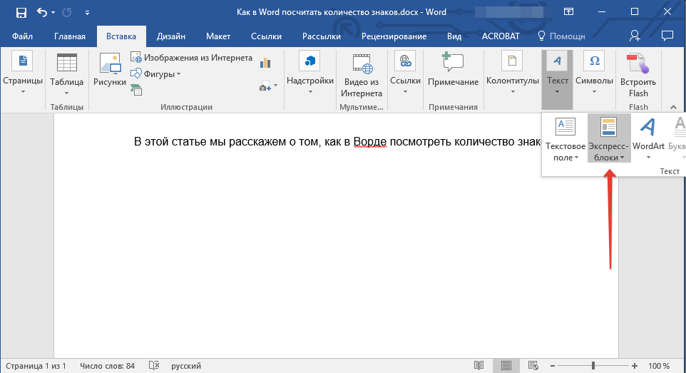2. Перейдите во вкладку “Вставка” и нажмите на кнопку “Экспресс-блоки”, расположенную в группе “Текст”.