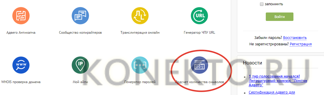 Заходим на сайт — advego.com. Прокручиваем страницу вниз и нажимаем на кнопку «Подсчет количества символов».